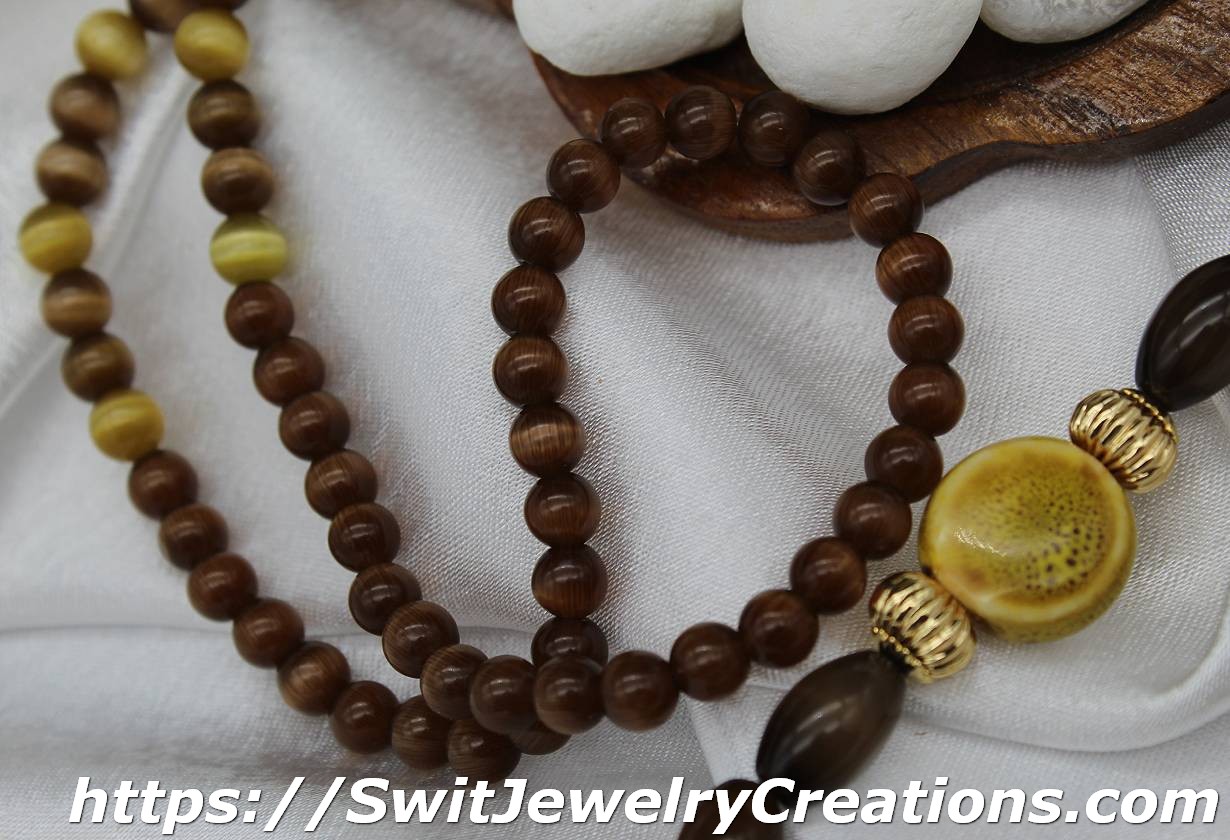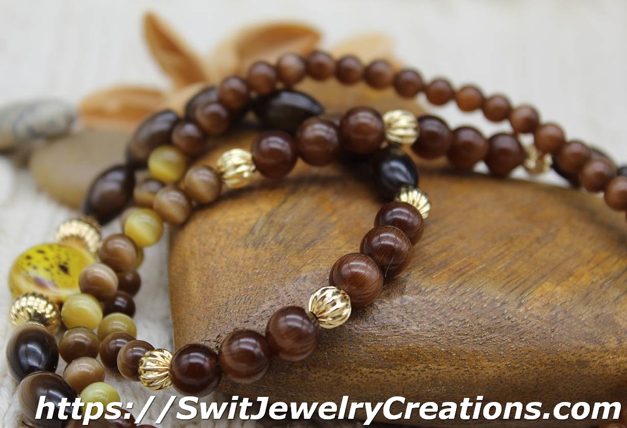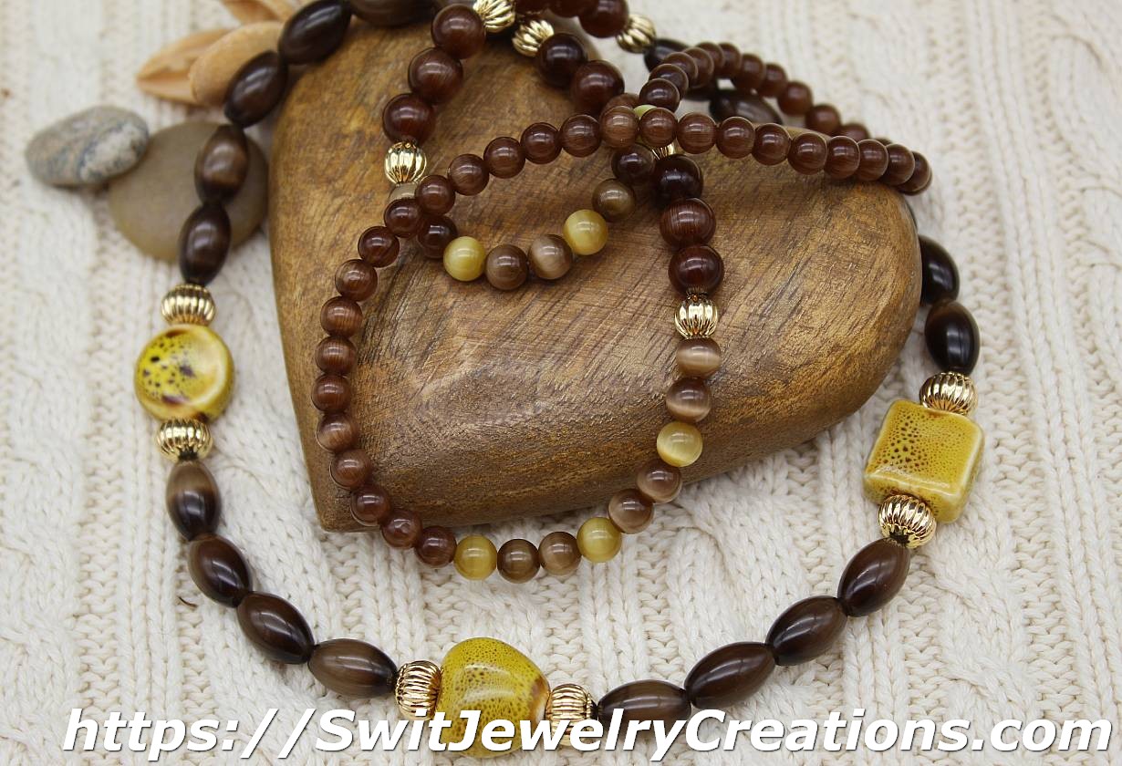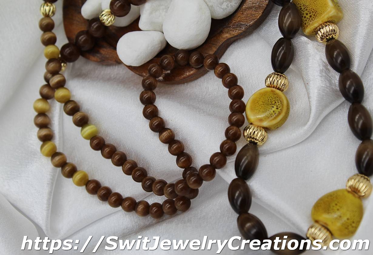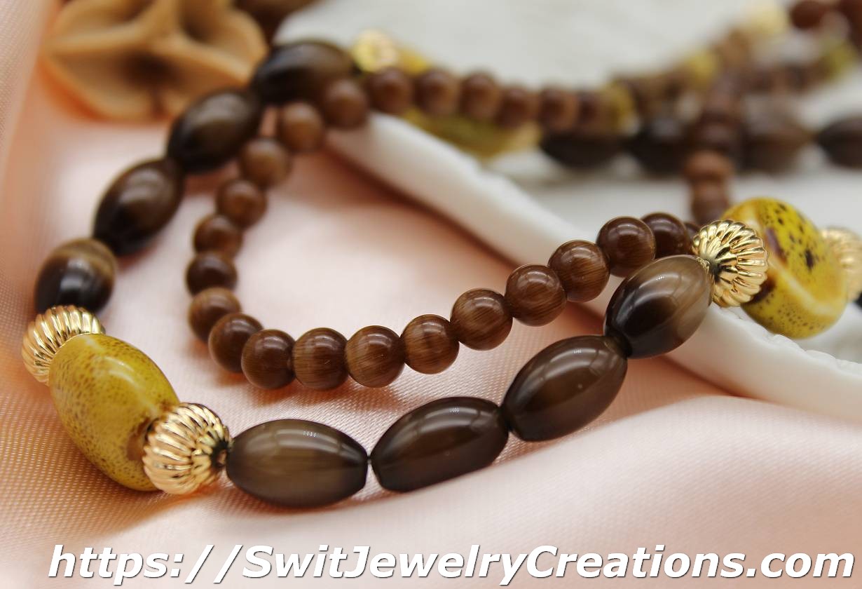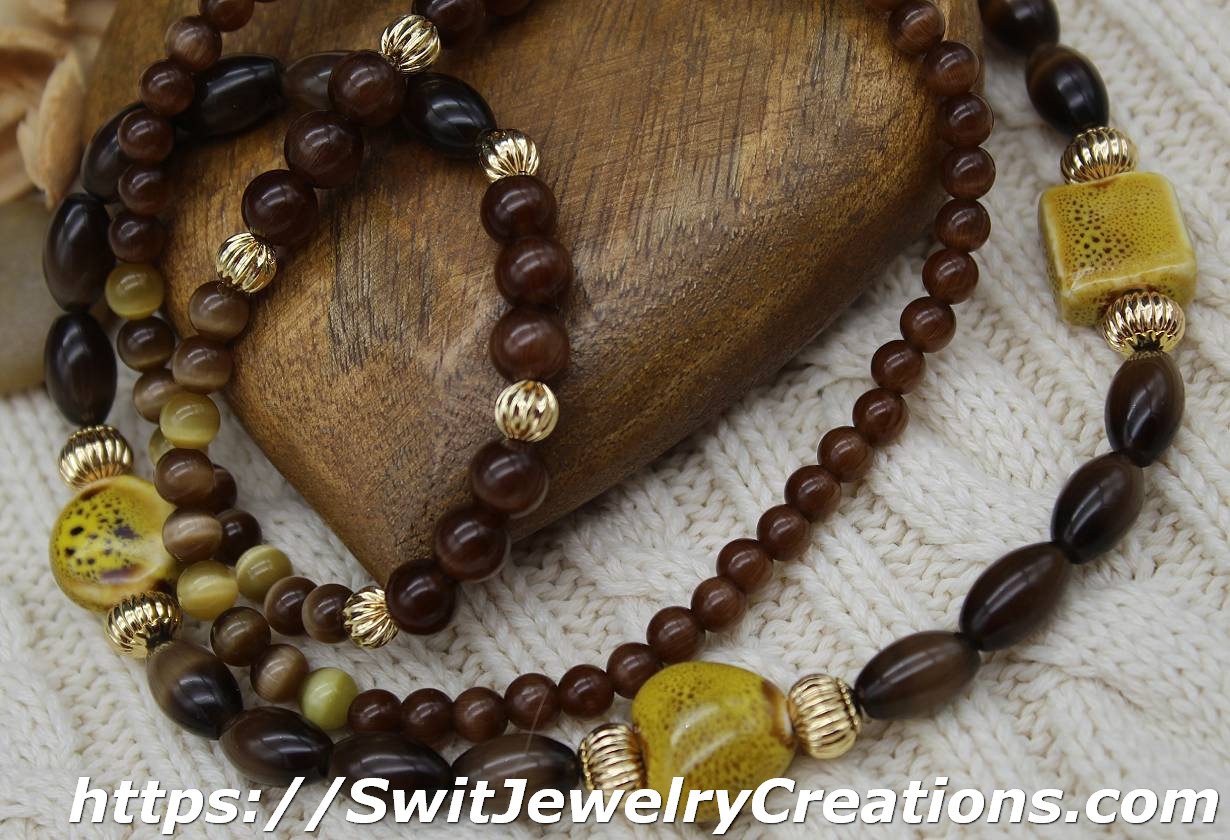 In this necklace, I combined a few sizes of cat eye coffee shade glass beads with 3 large mustard colored ceramic beads. I added 2 different size real 18K gold plated brass corrugated beads for contrast and texture. The length of this necklace is approximately 30 and 1/2 inches (77.5cm). This necklace would be a good addition to outfits in lighter shades of earth tones. It looks especially fantastic with a light beige color. Give brown a chance, who knows, maybe this color will become one of your favorites…