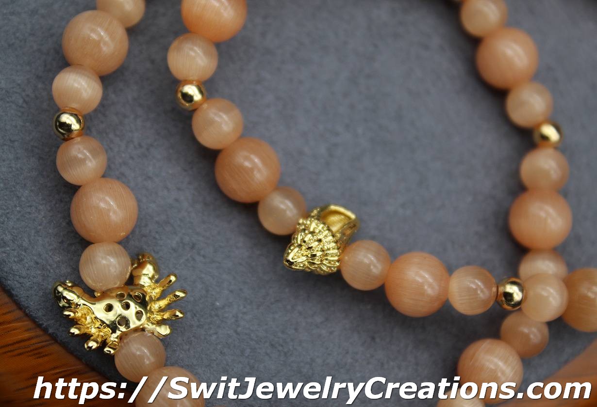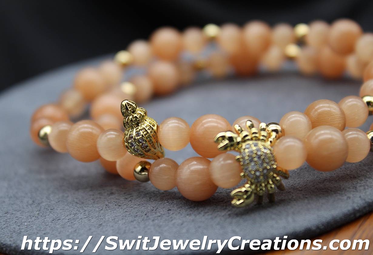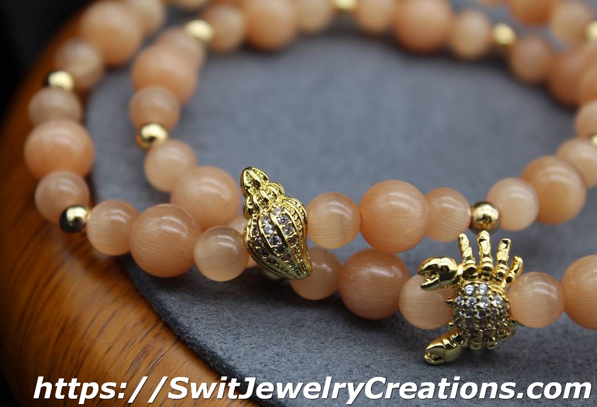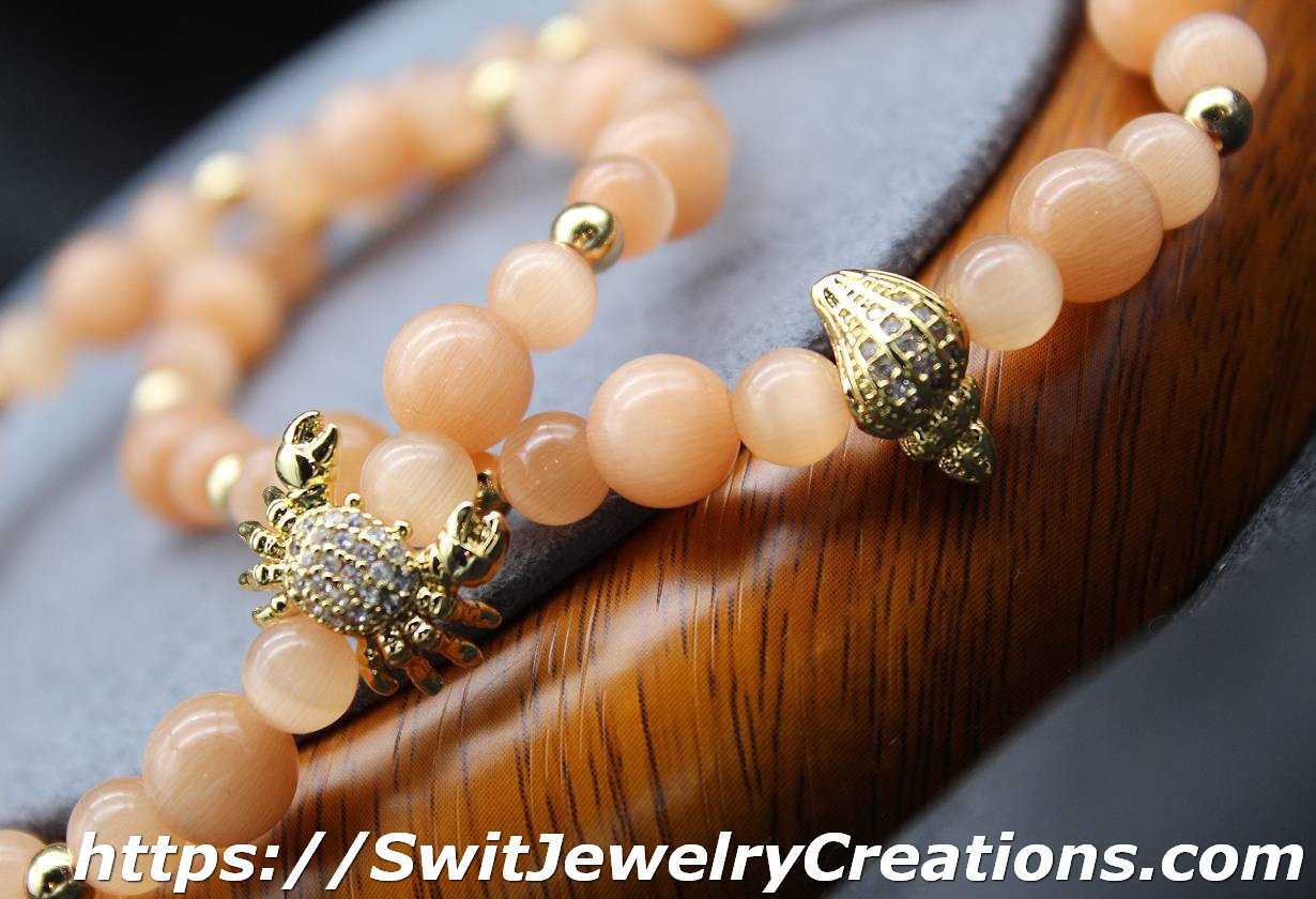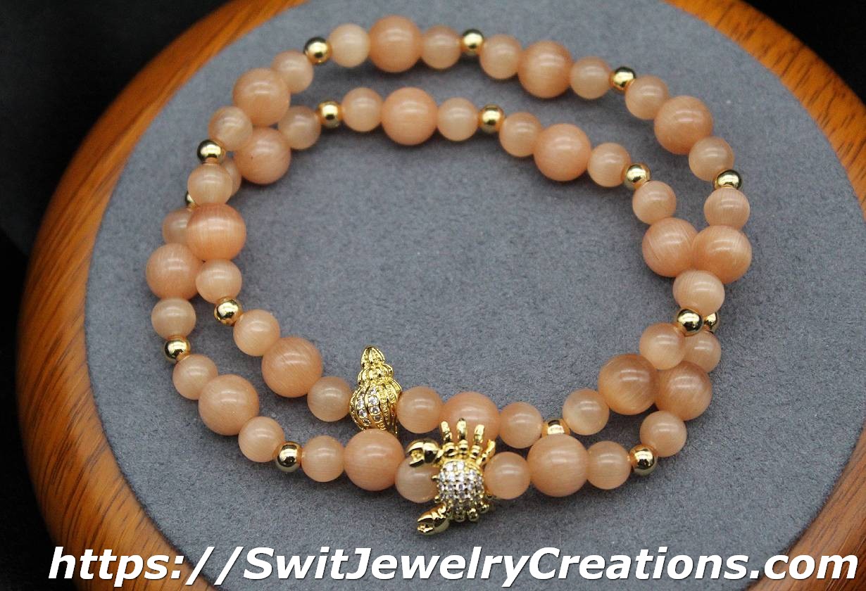 For this bracelet, I combined peach colored cat’s eye glass beads with a nautical themed center bead. All of the metal elements are brass with Real 18K Gold Plated. The central bead has rhinestones. This is a stretchy type of bracelet. The length of the bracelet is approximately 7 and 1/8 inches(18cm) in original form. Cat’s eye beads are about 6 mm and 8 mm in diameter. The shade of peach in this bracelet is neutral(calm) and will go with different styles of outfits.