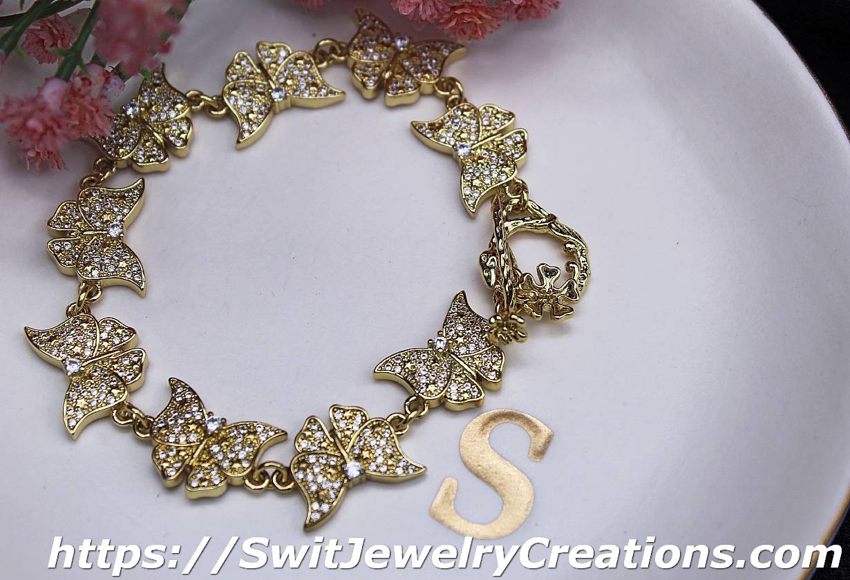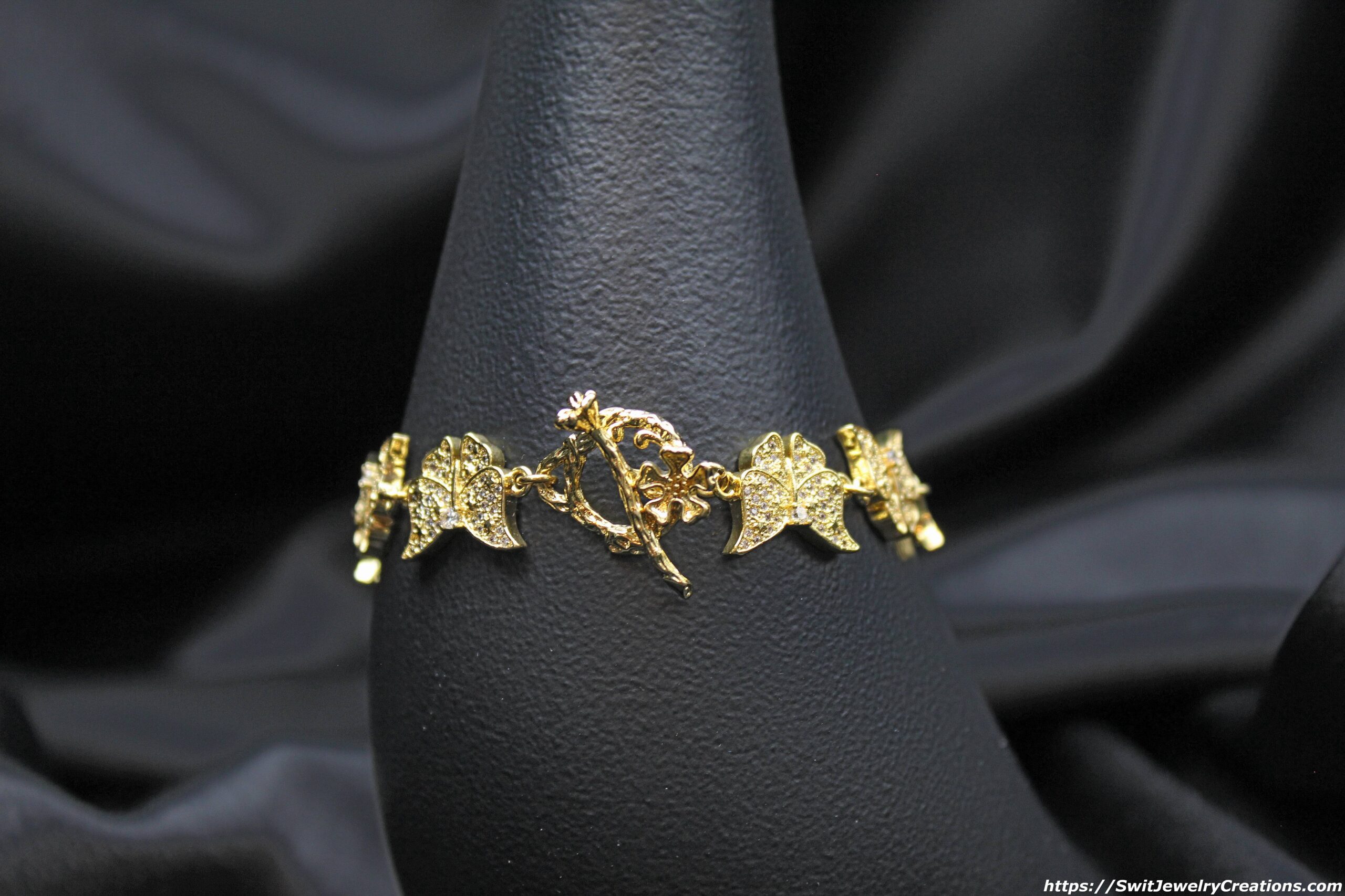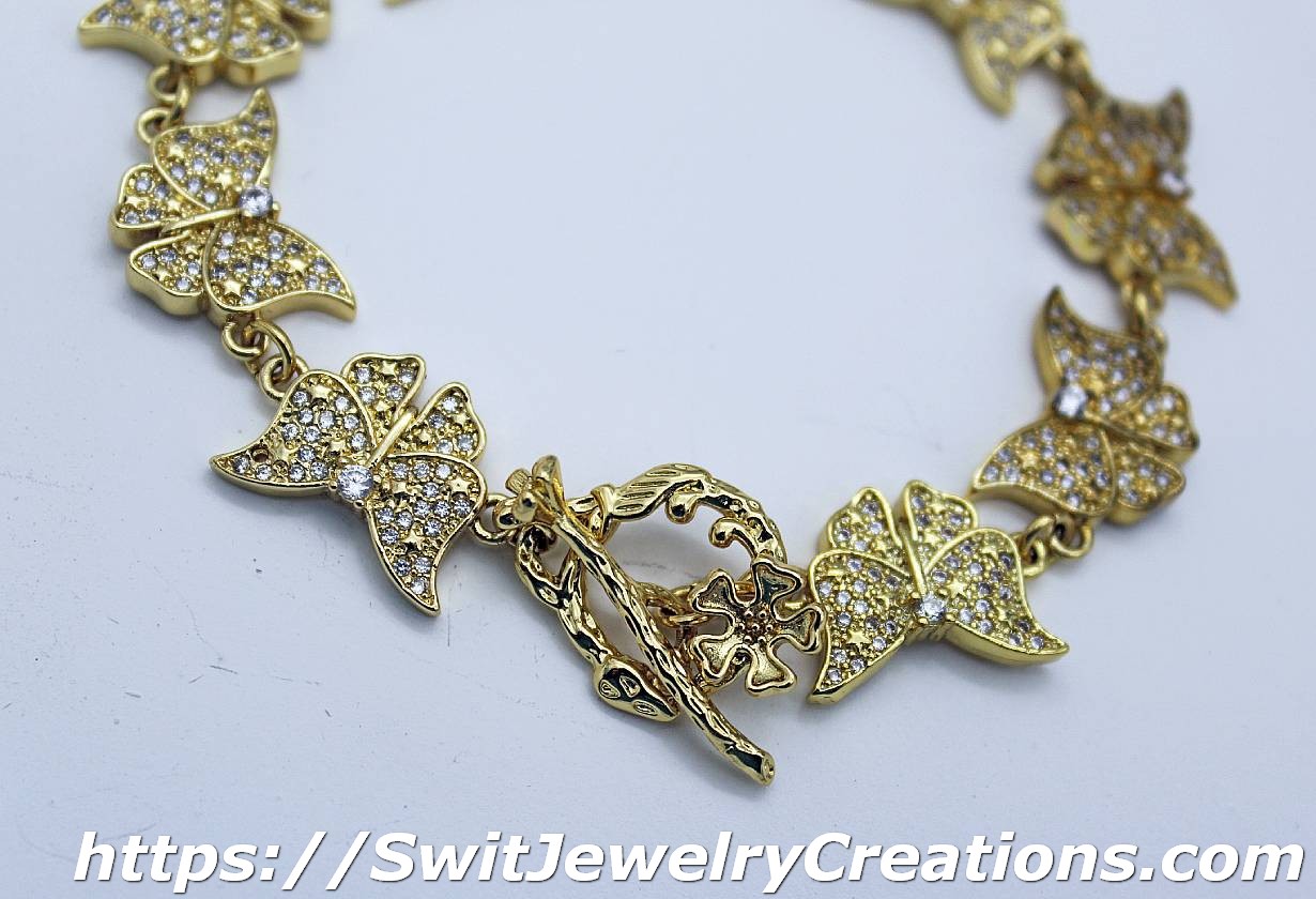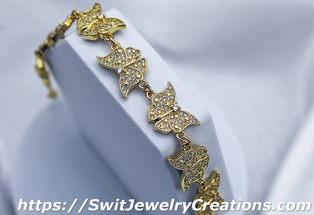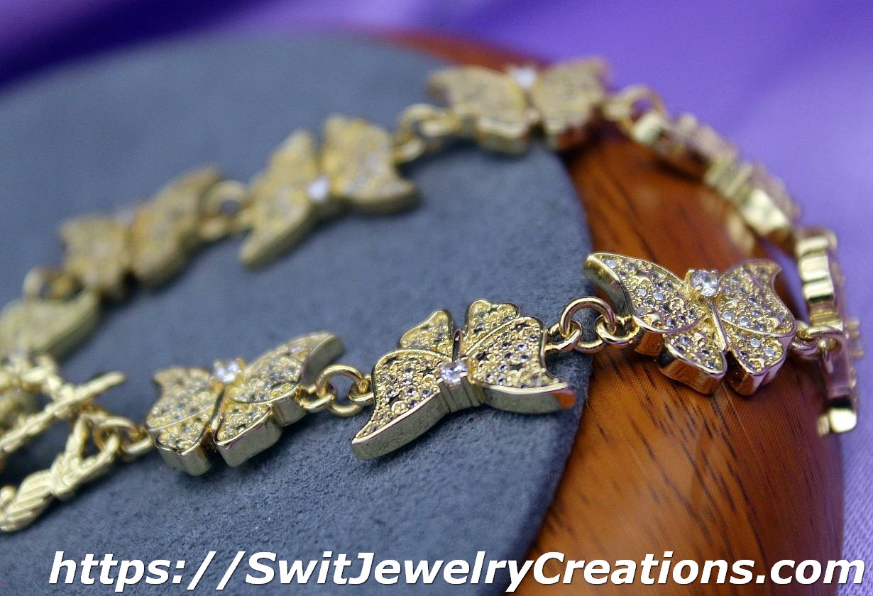 The material I used for this butterfly bracelet is real 18K gold plated brass with clear cubic zirconia. The links are flat on the back side but have a slight relief on the front side. The bracelet is about 7 and 1/2 inches long (19 cm) and about 1/2 inch (12 mm) wide.